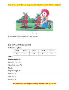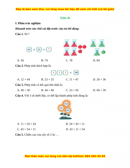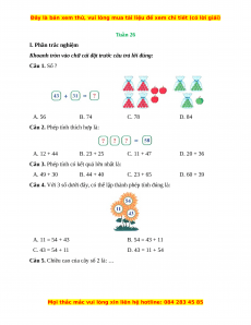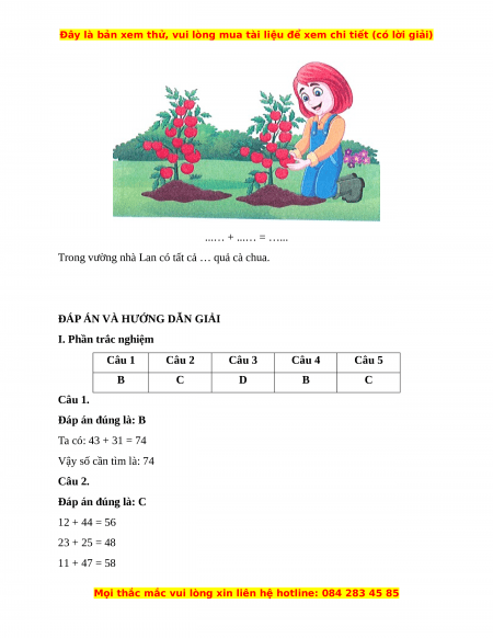 I. Phần trắc nghiệm Câu 1 Câu 2 Câu 3 Câu 4 Câu 5 B C D B C Câu 1. Đáp án đúng là: B Ta có: 43 + 31 = 74 Vậy số cần tìm là: 74 Câu 2. Đáp án đúng là: C 12 + 44 = 56 23 + 25 = 48 11 + 47 = 58