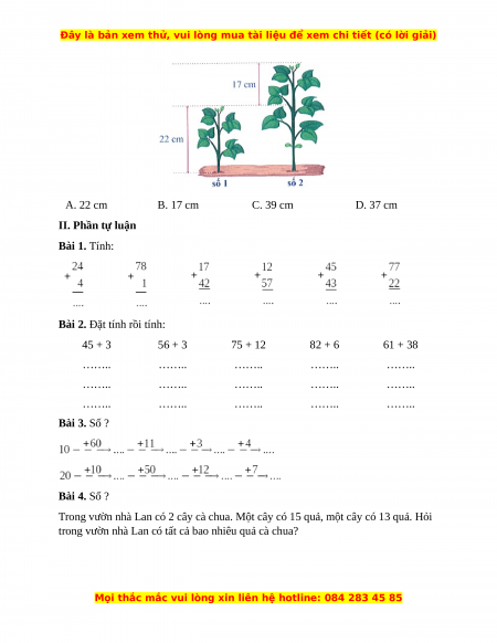 Vậy chiều cao cây số 2 là: 39 cm II. Phần tự luận Bài 1.