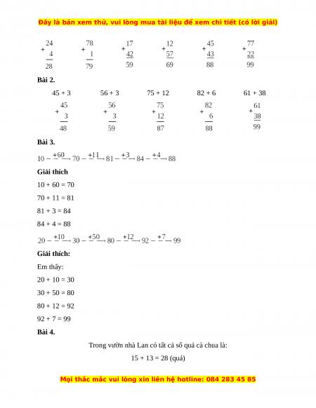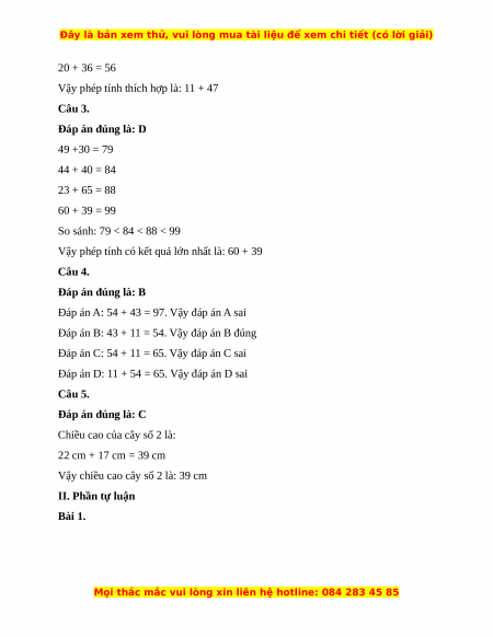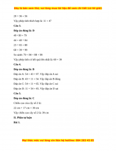Vậy phép tính thích hợp là: 11 + 47 Câu 3. Đáp án đúng là: D 49 +30 = 79 44 + 40 = 84 23 + 65 = 88 60 + 39 = 99