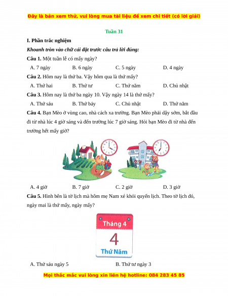 Câu 1. Một tuần lễ có mấy ngày? A. 7 ngày B. 6 ngày C. 5 ngày D. 4 ngày