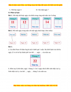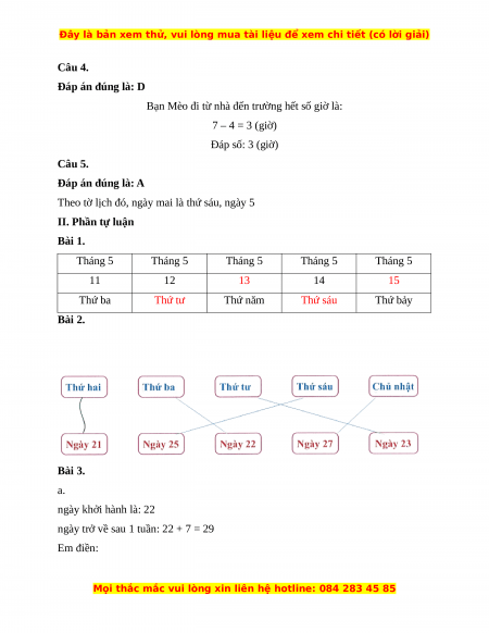 Theo tờ lịch đó, ngày mai là thứ sáu, ngày 5 II. Phần tự luận Bài 1. Tháng 5 Tháng 5 Tháng 5 Tháng 5 Tháng 5 11 12 13 14 15 Thứ ba Thứ tư Thứ năm Thứ sáu Thứ bảy Bài 2. Bài 3. a. ngày khởi hành là: 22