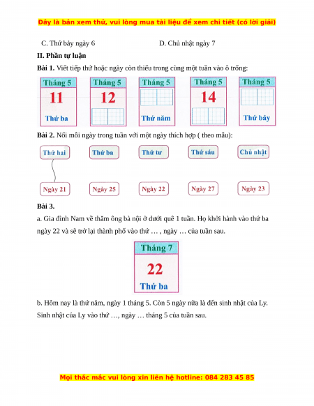 C. Thứ bảy ngày 6 D. Chủ nhật ngày 7 II. Phần tự luận