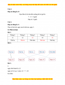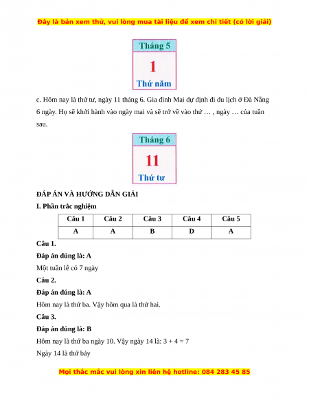 I. Phần trắc nghiệm Câu 1 Câu 2 Câu 3 Câu 4 Câu 5 A A B D A Câu 1. Đáp án đúng là: A Một tuần lễ có 7 ngày Câu 2. Đáp án đúng là: A