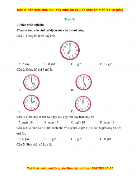 Câu 1. Đồng hồ dưới đây chỉ: A. 7 giờ B. 8 giờ C. 9 giờ D. 12 giờ
