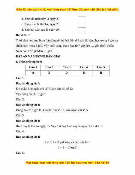 Đồng hồ chỉ 5 giờ là: kim dài chỉ số 12, kim ngắn chỉ số 5. Câu 3. Đáp án đúng là: D