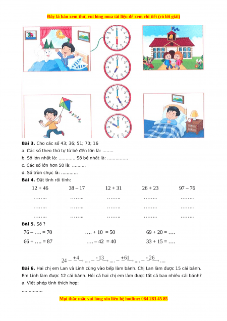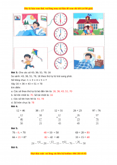 c. Các số lớn hơn 50 là: 51, 70 d. Số tròn chục là: 70 Bài 4. 12 + 46 38 – 17 12 + 31 26 + 23 97 – 76 Bài 5. 76 – 6. = 70 40 + 10 = 50 69 + 20 = 89 66 + 21 = 87 82 – 42 = 40 33 + 15 = 48 Bài 6.
