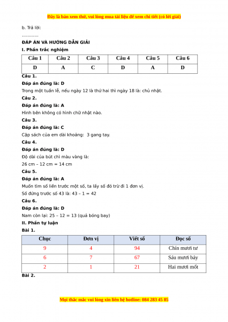 Câu 6. Nam có 25 quả bóng bay. Nam cho ly 12 quả. Nam còn lại: A. 25 quả bóng bay B. 12 quả bóng bay C. 37 quả bóng bay D. 13 quả bóng bay II. Phần tự luận Bài 1. Số ? Chục Đơn vị Viết số Đọc số … … … Chín mươi tư … … … Sáu mươi bảy … … … Hai mươi mốt