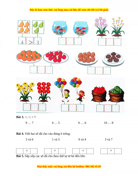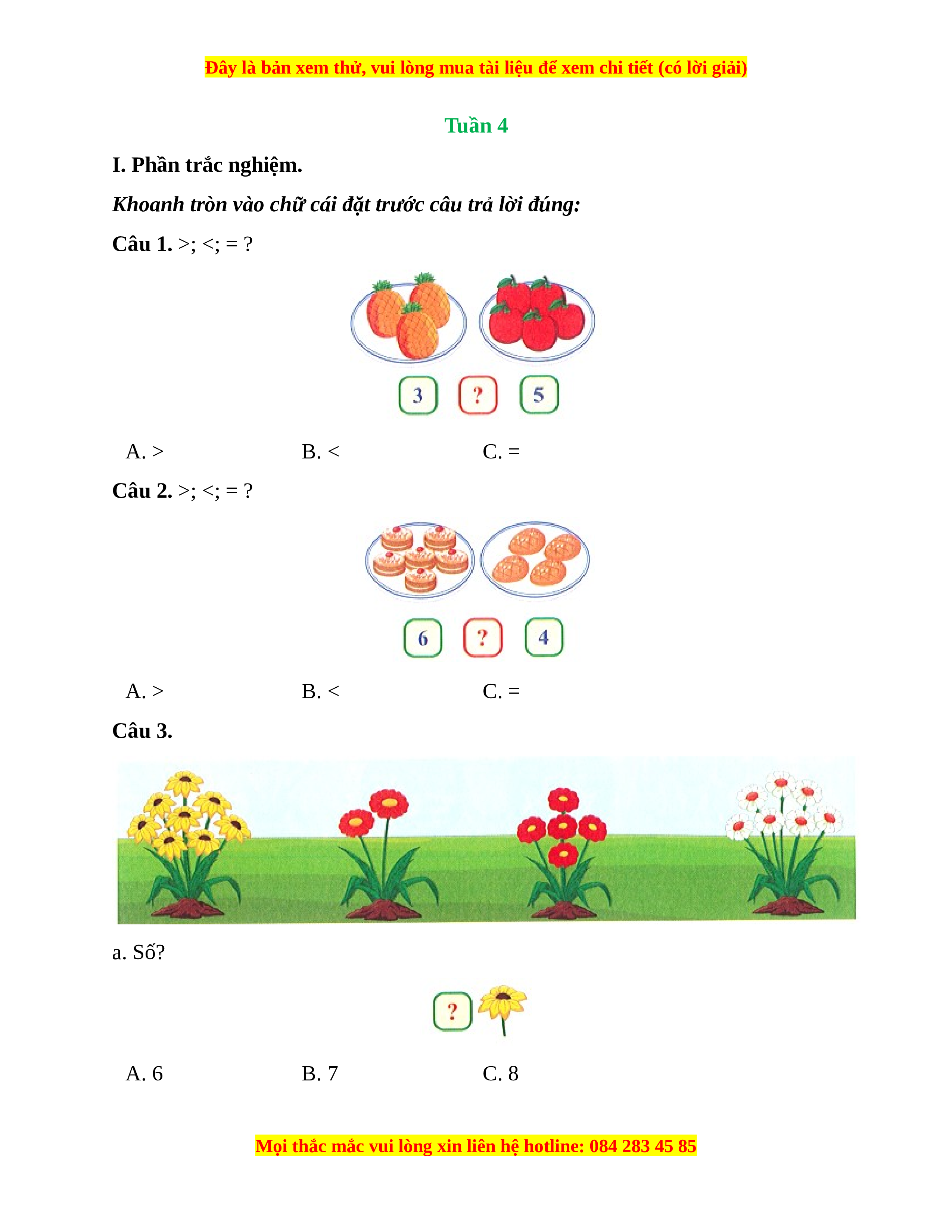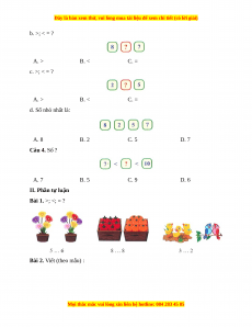 b. >; < = ? A. > B. < C. = c. >; < = ? A. > B. < C. = d. Số nhỏ nhất là: A. 8 B. 2 C. 5 D. 7 Câu 4. Số ? A. 7 B. 5 C. 9 D. 6 II. Phần tự luận Bài 1. >; <; = ?