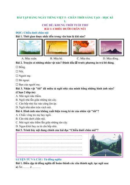 BÀI TẬP HẰNG NGÀY TIẾNG VIỆT 5 - CHÂN TRỜI SÁNG TẠO – HỌC KÌ I.