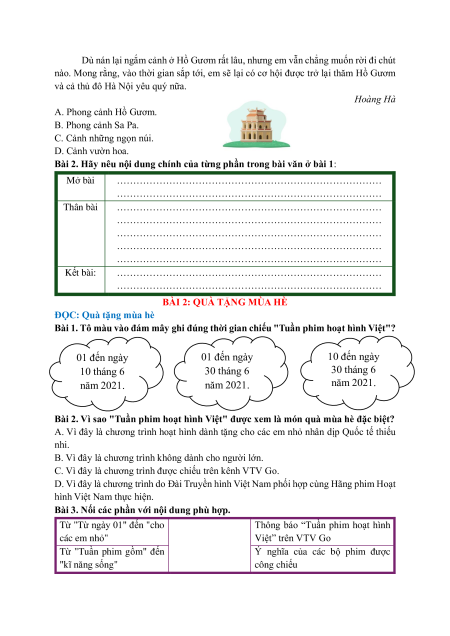 Bài 1. Tô màu vào đám mây ghi đúng thời gian chiếu "Tuần phim hoạt hình Việt"? 01 đến ngày 01 đến ngày 10 đến ngày 10 tháng 6 30 tháng 6 30 tháng 6 năm 2021. năm 2021. năm 2021.