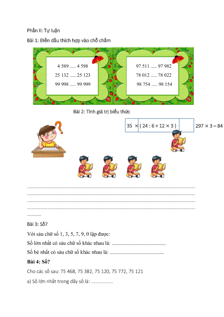 Bài 1: Điền dấu thích hợp vào chỗ chấm 4 589 . . . 4 598 97 511 . . . 97 982 25 132 . . . 25 123 78 012 . . . 78 022 99 998 . . . 99 999 98 754 . . . 98 154