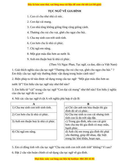 Phiếu bài tập Tuần 1 Tục ngữ về gia đình Ngữ văn 7