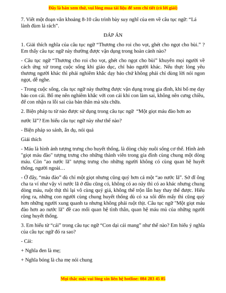 7. Viết một đoạn văn khoảng 8-10 câu trình bày suy nghĩ của em về câu tục ngữ: “Lá lành đùm lá rách”. ĐÁP ÁN