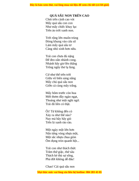 QUẢ SẤU NON TRÊN CAO Chót trên cành cao vót Mấy quả sấu con con Như mấy chiếc khuy lục Trên áo trời xanh non.