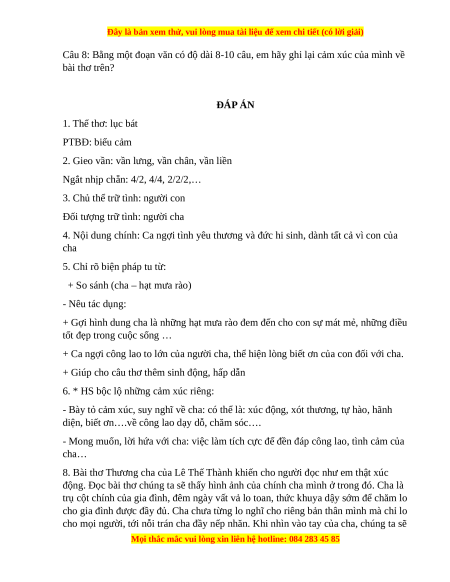 Câu 8: Bằng một đoạn văn có độ dài 8-10 câu, em hãy ghi lại cảm xúc của mình về bài thơ trên? ĐÁP ÁN 1. Thể thơ: lục bát PTBĐ: biểu cảm