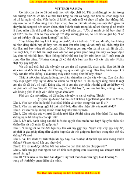 Phiếu bài tập Tuần 4 Vịt trời và Rùa Ngữ văn 7