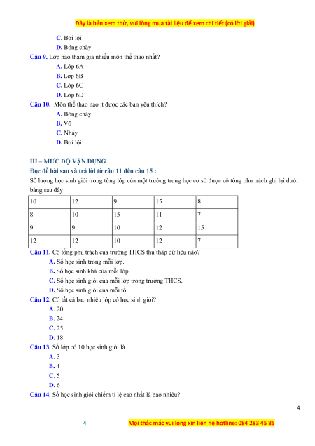 Câu 13. Số lớp có 10 học sinh giỏi là A. 3 B. 4 C. 5 D. 6