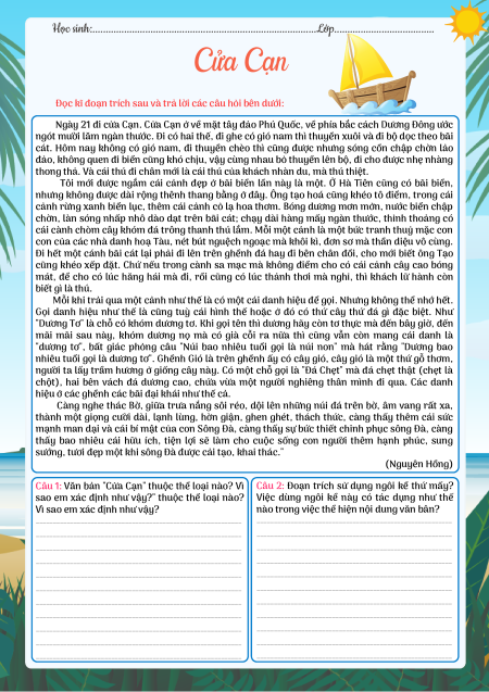 Câu 1: Văn bản "Cửa Cạn" thuộc thể loại nào? Vì Câu 2: Đoạn trích sử dụng ngôi kể thứ mấy?
