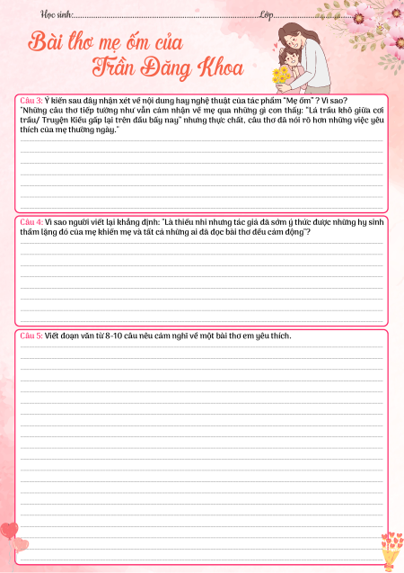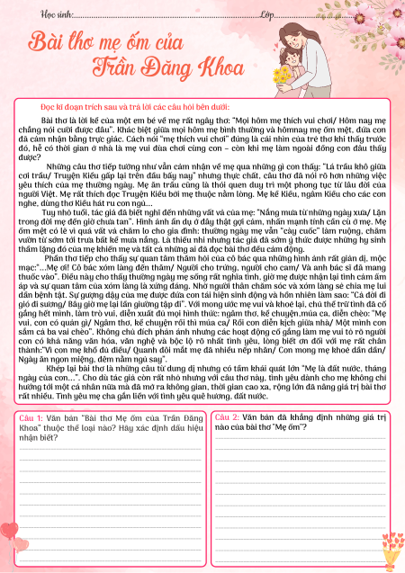 Học sinh:.....................................................................................Lớp...................................... Bài thơ mẹ ốm của Trần Đăng Khoa
