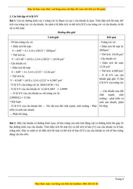 Bài 1: Giả sử, đường kính của 1 trứng cóc là 30μm và của 1 cầu khuẩn là 2μm. Tính diện tích bề mặt, thể