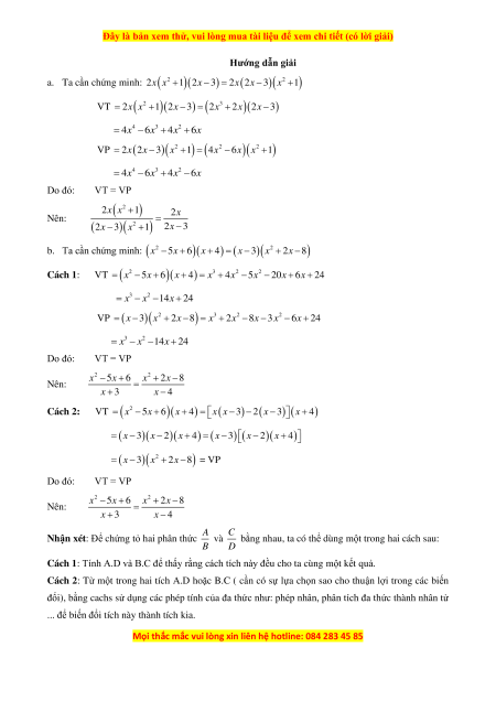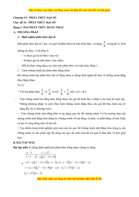 Dạng 1: HAI PHÂN THỨC BẰNG NHAU A. PHƯƠNG PHÁP