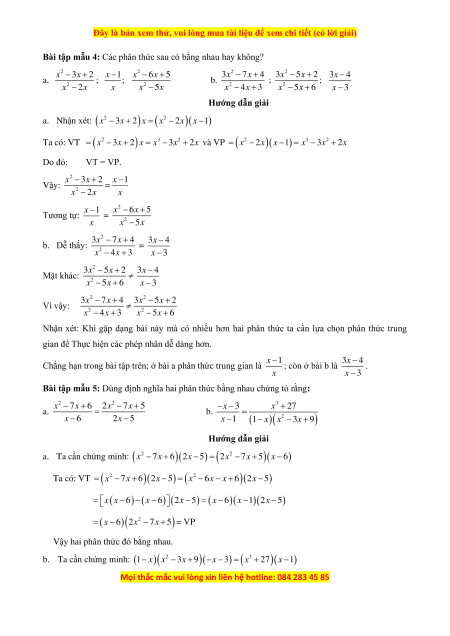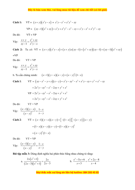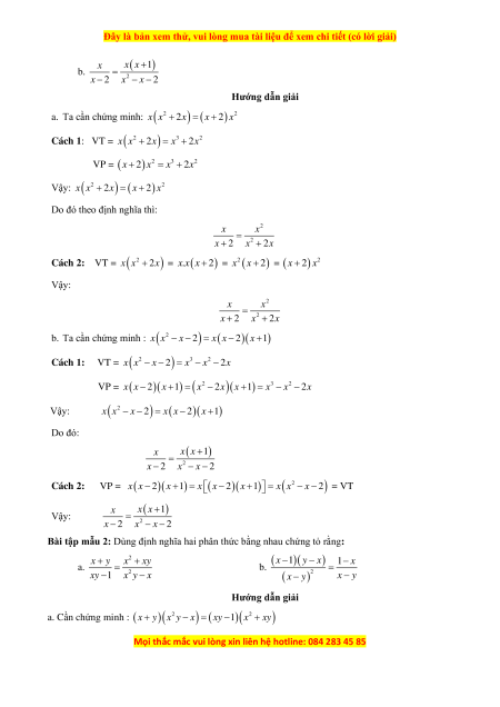 Bài tập mẫu 2: Dùng định nghĩa hai phân thức bằng nhau chứng tỏ rằng: 2 x + y x + xy (x − ) 1 ( y − x) 1− x a. = b. = 2 xy −1 x y − x (x − y)2 x − y Hướng dẫn giải
