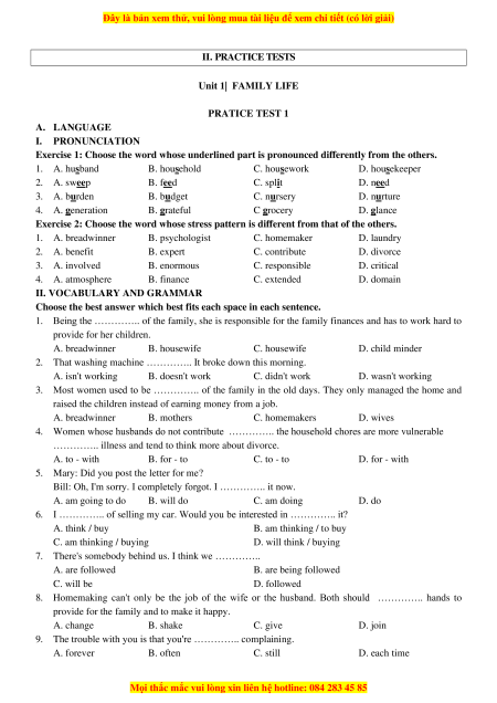 II. PRACTICE TESTS Unit 1| FAMILY LIFE PRATICE TEST 1 A. LANGUAGE I. PRONUNCIATION