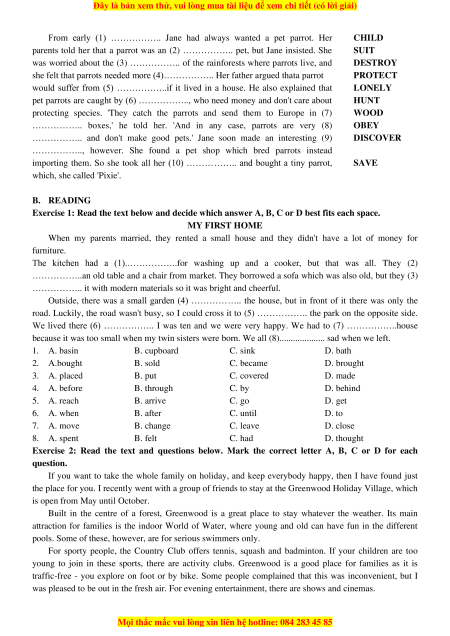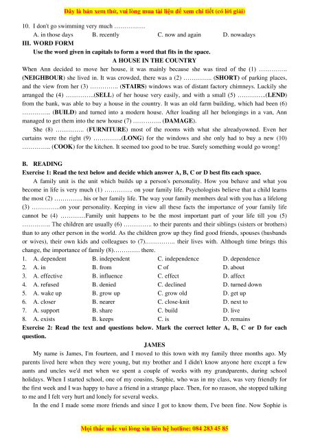 10. I don't go swimming very much …………… A. in those days B. recently C. now and again D. nowadays III. WORD FORM