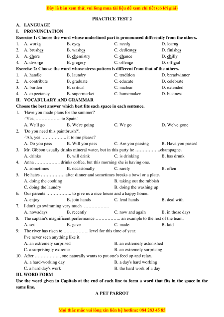 PRACTICE TEST 2 A. LANGUAGE I. PRONUNCIATION