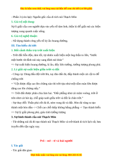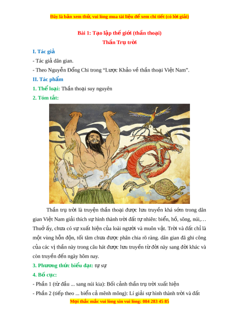 Đây là bản xem th , vu ử i lòng mua tài li u ệ đ xe ể m chi ti t (c ế ó l i ờ gi i ả ) - Ph n 3 ( ầ còn l i ạ ): Ngu n g ồ c ô c a di u tích núi Th ch ạ Môn 5. Giá tr n ị i ộ dung: S l ự í gi i ả c a u con ngư i ờ d a ự vào y u t ê t ô âm linh, th n kì ầ đ gi ể i ả mã các hi n ệ tư ng ợ xung quanh cu c s ô ông. 6. Giá tr ngh ị t ệ hu t ậ : - S d ử ng t ụ hành công y u t ê ô kỳ o ả hoang đư ng. ờ III. Tìm hi u chi ể ti t ế 1. B i ố cảnh th n t ầ r t ụ r i ờ xu t ấ hi n ệ - Tr i ờ đất hôn đ n, t ô ăm tôi, t nhi ự ên xu t ấ hi n m ệ t ô ông th n t ầ o l n, “b ớ ư c ớ m t ô bư c ớ t đ ừ nh núi i này sang đ nh núi i khác” => S xu ự t ấ hi n hoang đ ệ ư ng, kì ờ o, ả đ y l ầ iên tư ng, ơ tư ng t ơ ư ng phong phú. ợ 2. Lý giải sự xu t ấ hi n gi ệ a t ữ r i ờ và đ t ấ - Công c : ụ Dung đ u đ ầ i ô tr i ờ lên, tay đào đ t ấ đá, đ p ắ thành m t ô cái c t ô to đ ể chông tr i ờ + “C t ô đư c ợ đ p cao l ắ ên ch ng ừ nào thì tr i ờ t a ự nh m ư t ô t m ấ màn l n đ ớ ư c ợ dâng cao lên ch ng n ừ y ấ .” => Tr i ờ đ t ấ đư c phân chi ợ a làm hai. “Đất ph ng nh ẳ cái ư mâm vuông, tr i ờ ơ trên nh cái ư