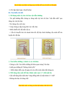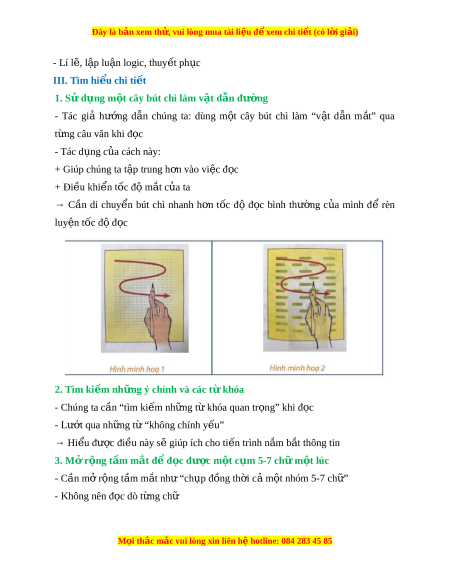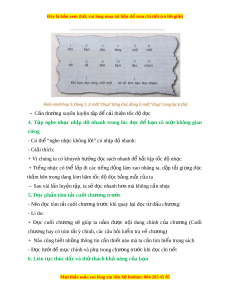 ộ cây bút chì làm v t ậ d n đ ẫ ư ng ờ - Tác giả hư ng ớ d n ẫ chúng ta: dùng m t ộ cây bút chì làm “v t ậ d n ẫ m t ắ ” qua t ng câu ừ văn khi đ c ọ - Tác d ng c ụ a ủ cách này: + Giúp chúng ta t p ậ trung h n ơ vào vi c đ ệ c ọ + Đi u khi ề n t ể ốc đ m ộ t ắ c a t ủ a → Cần di chuy n ể bút chì nhanh h n ơ t c ố độ đ c ọ bình thư ng ờ c a ủ mình để rèn luyện tốc đ đ ộ c ọ 2. Tìm ki m ế nh ng ý chí ữ nh và các t k ừ hóa - Chúng ta c n “t ầ ìm ki m ế nh ng t ữ khóa ừ quan tr ng” ọ khi đ c ọ - Lư t ớ qua nh ng t ữ “không chí ừ nh y u” ế → Hi u đ ể ược đi u này s ề ẽ giúp ích cho ti n t ế rình n m ắ b t ắ thông tin 3. Mở r ng t ộ m ầ m t ắ đ đ ể c đ ọ ư c ợ m t ộ c m ụ 5-7 ch m ữ t ộ lúc - Cần m r ở ng t ộ ầm m t ắ nh “ch ư p ụ đ ng t ồ h i ờ c m ả t ộ nhóm 5-7 ch ” ữ - Không nên đ c ọ dò t ng ch ừ ữ M i