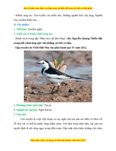 ả vệ tổ chim chìa vôi trong đêm bão, qua đó tác giả mu n ố giáo d c ụ nh ng ữ cô bé, c u ậ bé - nh ng ữ công dân tư ng ơ lai c a ủ chúng ta mang m t ộ t m ấ lòng nhân ái để b o ả vệ t ng ừ thứ nhỏ bé nh t ấ trên thế gi i ớ này. 8. Giá tr ngh ị t ệ hu t ậ : + Cách k chuy ể n t ệ heo ngôi th ba t ứ hú v , h ị p d ấ n. ẫ + Ngh t ệ hu t ậ miêu tả nhân v t ậ qua l i ờ đ i ố tho i ạ đ c s ặ c. ắ + Ngôn ngữ g n ầ gũi giúp cho nh ng ữ l i ờ đ i ố tho i ạ c a ủ các nhân v t ậ đư c ợ thể hiện m t ộ cách chân th c, s ự inh đ ng. ộ III. Tìm hi u chi ể ti t ế 1. Nhân v t ậ em Mon M i