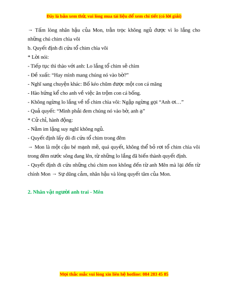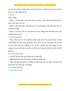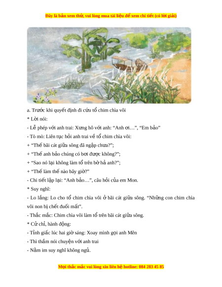 Đây là bản xem th , vu ử i lòng mua tài li u ệ đ xe ể m chi ti t (c ế ó l i ờ gi i ả ) a. Trư c ớ khi quy t ế đ nh đi ị c u ứ t chi ổ m chìa vôi * L i ờ nói: - L phép v ễ i ớ anh trai: X ng hô v ư i ớ anh: “Anh i ơ …”, “Em b o” ả - Tò mò: Liên t c ụ h i ỏ anh trai v t ề chi ổ m chìa vôi: + “Th bãi ế cát gi a ữ sông đã ng p ậ ch a?”; ư + “Th anh b ế o ả chúng có b i ơ đư c ợ không?”; + “Sao nó l i ạ không làm t t ổ rên b h ờ anh?”; ả + “Th l ế àm th nào bây gi ế ?” ờ - Chi ti t ế l p ặ l i ạ : “Anh b o…”, ả câu h i ỏ c a ủ em Mon. * Suy nghĩ: - Lo l ng: ắ