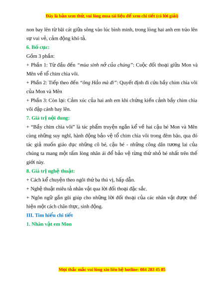 ủ chúng”: Cuộc đối tho i ạ gi a ữ Mon và Mên v t ề ổ chim chìa vôi. + Ph n ầ 2: Ti p ế theo đ n ế “ông H o ả mà đi”: Quy t ế đ nh ị đi c u ứ b y ầ chim chìa vôi c a ủ Mon và Mên + Ph n ầ 3: Còn l i ạ : C m ả xúc c a ủ hai anh em khi ch ng ứ ki n ế c nh ả b y ầ chim chìa vôi đ p ậ cánh bay lên. 7. Giá tr n ị i ộ dung: + “B y