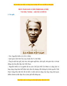 Bài 6: Hành trình tri th c ( ứ Ngh l ị u n xã h ậ i ộ ) Văn bản: T h ự c ọ – m t ộ thú vui b í ổ ch I. Tác giả - Tên: Nguy n H ễ i n L ế ê (1912-1984) - Quê quán: t nh S ỉ n ơ Tây (nay thu c B ộ a Vì, Hà N i ộ ) - Ông là m t ộ h c ọ gi , ả nhà văn, nhà ngôn ng ữ h c, ọ d ch ị gi , ả nhà giáo d c ụ và ho t ạ đ ng ộ văn hóa đ c l ộ p ậ c a ủ Vi t ệ Nam. - Nguy n ễ Hi n ế Lê là ngư i ờ r t ấ tin yêu Chủ t ch ị Hồ Chí Minh và c ng ộ s n ả và