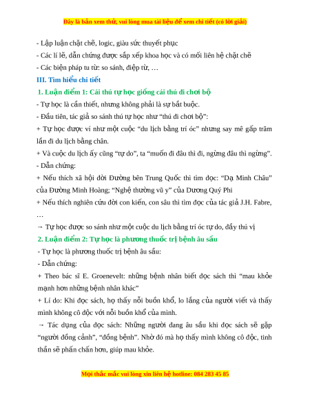 Đây là bản xem th , vu ử i lòng mua tài li u ệ đ xe ể m chi ti t (c ế ó l i ờ gi i ả ) - L p l ậ u n ch ậ t ặ ch , l ẽ ogic, giàu s c ứ thuy t ế ph c ụ - Các lí l , d ẽ n ch ẫ ng đ ứ ư c ợ s p ắ x p khoa h ế c ọ và có m i ố liên h ch ệ t ặ chẽ - Các bi n pháp ệ tu t : ừ so sánh, đi p t ệ , … ừ III. Tìm hi u chi ể ti t ế 1. Luận đi m ể 1: Cái thú t h ự c gi ọ ng cái ố thú đi ch i ơ bộ - T h ự c l ọ à c n t ầ hi t ế , nh ng ư không ph i ả là sự b t ắ bu c. ộ - Đầu tiên, tác gi s ả o sánh thú tự h c nh ọ “t ư hú đi ch i ơ b ”: ộ + Tự h c ọ đư c ợ ví như m t ộ cu c ộ “du l ch ị b ng ằ trí óc” nh ng ư say mê g p ấ trăm