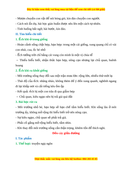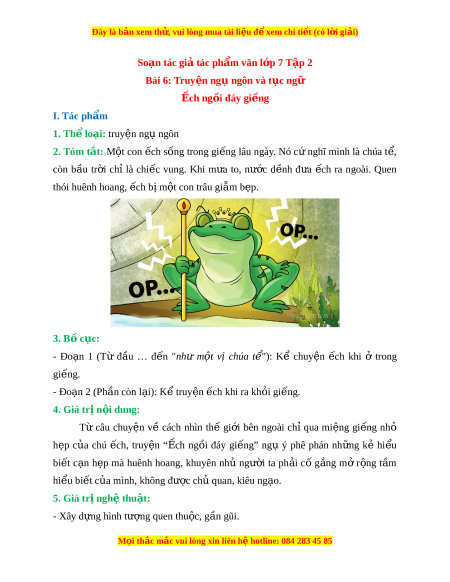 Đây là bản xem th , vu ử i lòng mua tài li u ệ đ xe ể m chi ti t (c ế ó l i ờ gi i ả ) Soạn tác gi t ả ác ph m ẩ văn l p 7 ớ T p 2 ậ Bài 6: Truy n n ệ g ngôn và t ụ c ng ụ ữ Ếch ng i ồ đáy gi ng ế I. Tác ph m ẩ 1. Th l ể oại: truy n ng ệ ngôn ụ 2. Tóm t t ắ : M t ộ con ch ế s ng ố trong gi ng ế lâu ngày. Nó c ứ nghĩ mình là chúa t , ể còn b u ầ tr i ờ chỉ là chi c ế vung. Khi m a ư to, nư c ớ d nh ề đ a ư ch ế ra ngoài. Quen thói huênh hoang, ch ế b m ị t ộ con trâu gi m ẫ b p ẹ . 3. B c ố ục: - Đo n ạ 1 (Từ đ u ầ … đ n ế "như m t