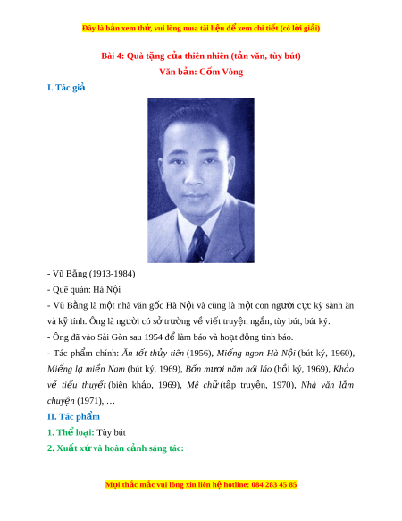 ủ hiên nhiên (t n văn, t ả ùy bút) Văn bản: C m ố Vòng I. Tác giả - Vũ B ng ( ằ 1913-1984) - Quê quán: Hà N i ộ - Vũ B ng ằ là m t ộ nhà văn g c ố Hà N i ộ và cũng là m t ộ con ngư i ờ c c ự kỳ sành ăn