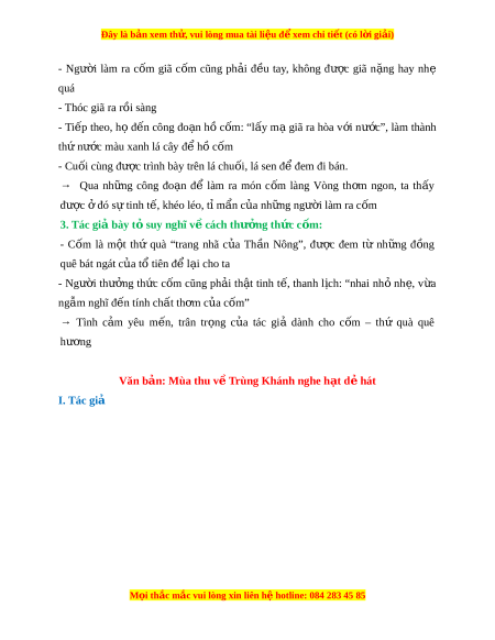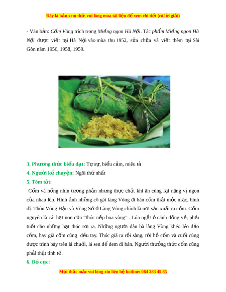 Đây là bản xem th , vu ử i lòng mua tài li u ệ đ xe ể m chi ti t (c ế ó l i ờ gi i ả ) - Ph n 1: ầ T đ ừ u đ ầ n “h ế t ạ thóc ra thành c m ố ”: Gi i ớ thi u v ệ c ề m ố - Ph n 2: ầ Ti p ế đ n “t ế h m ơ tho, l l ạ ùng”: Công đo n l ạ àm ra c m ố - Ph n 3: ầ Còn l i ạ : Ngư i ờ thư ng ở th c c ứ m ố ph i ả nh nhàng, t ẹ inh tế 7. Giá tr n ị i ộ dung: - Văn b n