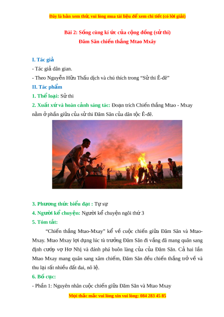Đây là bản xem th , vu ử i lòng mua tài li u ệ đ xe ể m chi ti t ế (có l i ờ gi i ả ) Bài 2: S ng cùng k ố í c c ứ a c ủ ng ộ đ ng ( ồ s t ử hi) Đăm Săn chi n t ế h ng Mt ắ ao Mxây I. Tác giả - Tác gi dân gi ả an. - Theo Nguy n H ễ u ữ Th u d ấ ch và chú t ị hích trong “S t ử hi Ê-đê” II. Tác ph m ẩ 1. Thể loại: S t ử hi