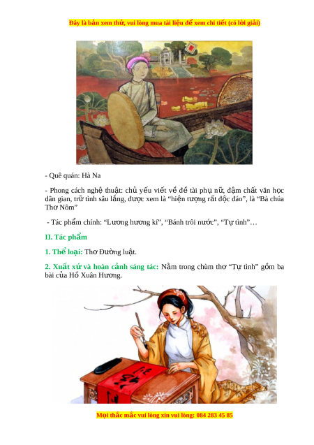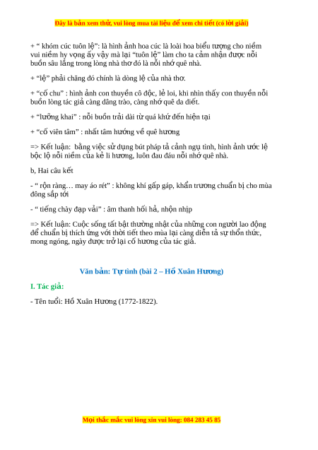 ô àng… may áo ret” : không khí g p gáp, kh ấ n t ẩ rư ng chu ơ n b ẩ cho m ị ùa đông s p t ă i ớ - “ ti ng chày đ ế p ạ v i ả ” : âm thanh h i ố h , ả nh n nh ô p ị => K t ế lu n: ậ Cu c s ô ng ố t t ấ b t ậ thư ng nh ờ t ậ c a ủ nh ng con ng ư ư i ờ lao đ ng ô đ chu ể ẩn bị thích ng v ứ i ớ th i ờ ti t ế theo mùa l i ạ càng di n t ễ s ả t ự h n t ổ h c, ứ mong ngóng, ngày đư c ợ tr l ở i ạ cố hư ng c ơ a ủ tác gi . ả Văn bản: T t ự inh (bài 2 – H X ồ uân Hư ng) ơ I. Tác gi : ả - Tên tu i ổ : H X ồ uân Hư ng ơ (1772-1822). M i ọ thắc m c