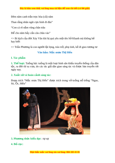 1. Thể loại: Tuông hai: tuông la m t ô lo i a hinh sân kh u t â ruy n t ê h ng c ố a u dân t c, ô ra đ i ơ t ư xa x a, ư do cac tac gi a dân gian sang tac va đư c ơ l u ư truy n ê t i ơ ngay nay. 2. Xuất x và hoàn c ứ nh s ả áng tác: Đo n a trich “M c ă m u ư Th iH n” ê đư c ơ trich trong v ơ tu ng ô n ô ti ng ê “Ngao, So, c, H Ô n” ê 3. Phư ng ơ th c bi ứ u đ ể t ạ : t s ư ư 4. B c ố ục: M i ọ thắc m c