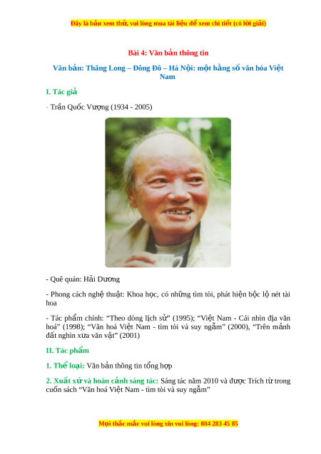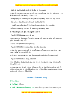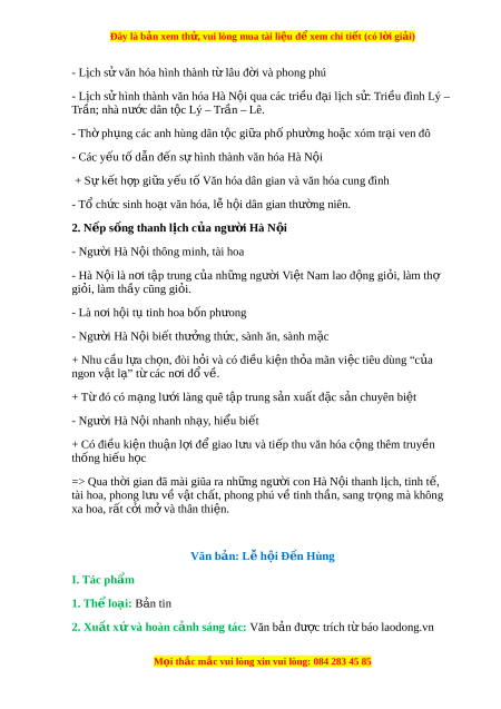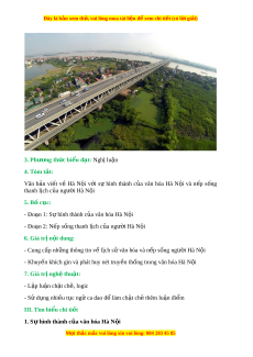 Đây là bản xem th , vu ử i lòng mua tài li u ệ đ xe ể m chi ti t (c ế ó l i ờ gi i ả ) 3. Phư ng ơ th c bi ứ u đ ể t ạ : Nghị lu n ậ 4. Tóm tắt: Văn b n ả vi t ế về Hà N i ộ v i ớ sự hình thành c a ủ văn hóa Hà N i ộ và n p ế s ng ố thanh lịch c a ủ ngư i ờ Hà N i ộ 5. B c ố ục: - Đo n 1: ạ S hì ự nh thành c a ủ văn hóa Hà N i ộ - Đo n 2: ạ N p ế s ng t ố hanh l ch c ị a ng ủ ư i ờ Hà N i ộ 6. Giá tr n ị i ộ dung: - Cung cấp nh ng t ữ hông tin v l ề ch s ị ử văn hóa và n p s ế ng ố ngư i ờ Hà N i ộ - Khuy n khí ế