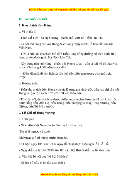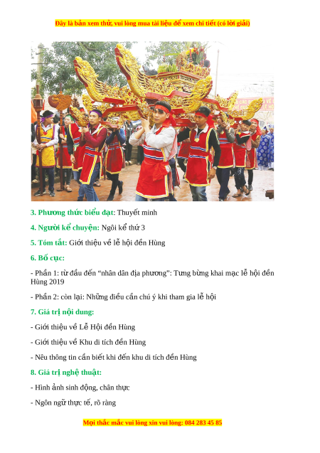 Đây là bản xem th , vu ử i lòng mua tài li u ệ đ xe ể m chi ti t (c ế ó l i ờ gi i ả ) 3. Phư ng ơ th c bi ứ u đ ể t ạ : Thuy t ế minh 4. Ngư i ờ k chuy ể n: ệ Ngôi k t ể h 3 ư 5. Tóm tắt: Gi i ớ thi u v ệ l ề h ê i ộ đ n H ề ung 6. B c ố ục: - Ph n 1: ầ t đ ừ u ầ đ n “nhân ế dân đ a ph ị ư ng”: ơ T ng ư b ng ừ khai m c ạ l ê h i ộ đ n ề Hung 2019 - Ph n 2: ầ còn l i ạ : Nh ng đi ữ u c ề n chú ý khi ầ tham gia l h ê i ộ 7. Giá tr n ị i ộ dung: - Gi i ớ thi u v ệ L ề H ê i ộ đ n H ề ung - Gi i ớ thi u v ệ K ề hu di tích đ n H ề ung - Nêu thông tin c n bi ầ t ế khi đ n khu di ế tích đ n H ề ung 8. Giá tr ngh ị t ệ hu t ậ : - Hình nh s ả inh đ ng, chân t ộ h c ự - Ngôn ng t ữ h c t ự , r ế õ ràng M i ọ thắc m c