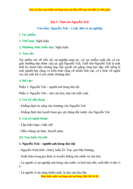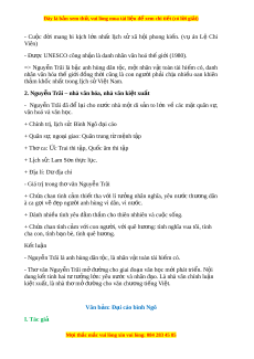1. Thể loại: Nghị lu n ậ 2. Phư ng t ơ h c bi ứ u đ ể t ạ : Nghị lu n ậ 3. Tóm t t ắ : Tác ph m ẩ nói về ti u ể s , ử sự nghi p ệ sáng tác, các tác ph m ẩ xu t ấ s c ắ và các gi i ả thư ng ở đ t ạ đư c ợ c a ủ tác giả Nguy n ễ Trãi. Tu i ổ thơ Nguy n ễ Trãi là m t ộ th i ờ kỳ thanh b n ầ nh ng ư ông v n ẫ quy t ế chí g ng ắ công h c ọ t p, ậ n i ổ ti ng ế là m t ộ ngư i ờ h c ọ r ng, ộ có ki n ế th c ứ r ng ộ v ề nhi u ề lĩnh v c, ự có ý th c ứ v ề nghĩa v c ụ a m ủ t ộ kẻ sĩ yêu nư c ớ thư ng ơ dân. 4. Bố cục: Ph n 1: ầ Nguy n ễ Trãi – ngư i ờ anh hùng dân t c ộ Ph n 2: ầ Nguy n