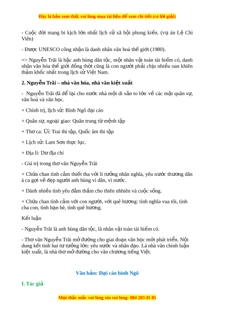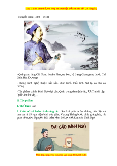 Đây là bản xem th , vu ử i lòng mua tài li u ệ đ xe ể m chi ti t ế (có l i ờ gi i ả ) - Nguy n ễ Trãi (1380 – 1442) - Quê quán: làng Chi Ng i ạ , huy n ệ Phư ng ợ S n, ơ l ộ L ng ạ Giang (nay thu c ộ Chí Linh, H i ả Dư ng) ơ . - Phong cách nghệ thu t ậ : s c ắ s o, ả khúc tri t ế , th u ấ tình đ t ạ lý, có nhu có cư ng ơ