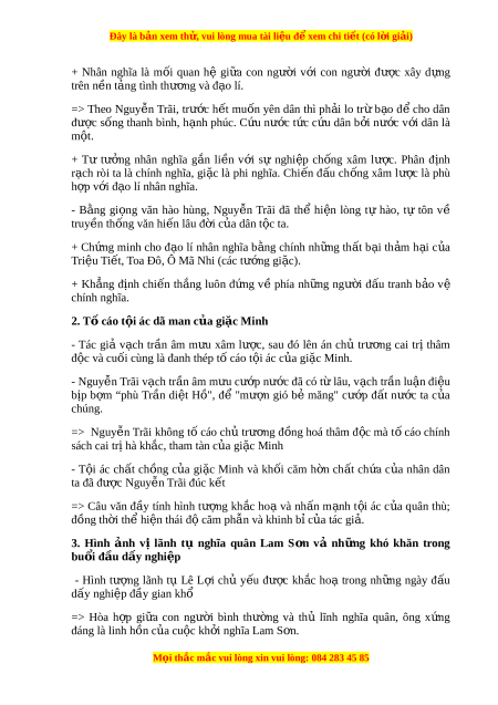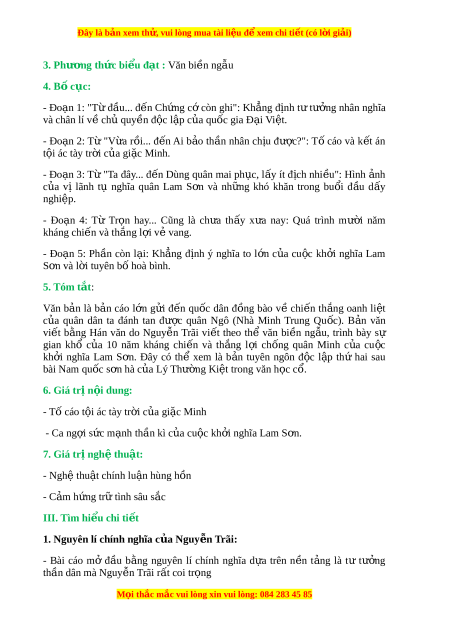 Đây là bản xem th , vu ử i lòng mua tài li u ệ đ xe ể m chi ti t (c ế ó l i ờ gi i ả ) 3. Phư ng ơ th c bi ứ u đ ể t ạ : Văn bi n ề ng u ẫ 4. B c ố ục: - Đo n ạ 1: "T đ ừ u... đ ầ n ế Ch ng ứ c còn ớ ghi": Kh ng ẳ đ nh ị t t ư ư ng ở nhân nghĩa và chân lí v ch ề quy ủ n đ ề c ộ l p c ậ a ủ qu c gi ố a Đ i ạ Vi t ệ . - Đo n ạ 2: T ừ "V a ừ r i ồ ... đ n ế Ai b o ả th n ầ nhân ch u ị đư c?" ợ : T ố cáo và k t ế án t i ộ ác tày tr i ờ c a ủ gi c ặ Minh. - Đo n ạ 3: T ừ "Ta đây... đ n ế Dùng quân mai ph c, ụ l y ấ ít đ ch ị nhi u" ề : Hình nh ả c a
