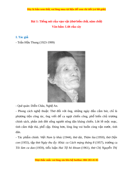 Đây là bản xem th , vu ử i lòng mua tài li u ệ đ xe ể m chi ti t (c ế ó l i ờ gi i ả ) Bài 1: Ti ng nói ế c a v ủ n v ạ t ậ (th b ơ n ch ố , nă ữ m ch ) ữ Văn bản: L i ờ c a cây ủ I. Tác giả - Trần H u ữ Thung (1923-1999) - Quê quán: Di n C ễ hâu, Ngh ệ An. - Phong cách nghệ thu t ậ : Thơ đ i ố v i ớ ông, nh ng ữ ngày đ u ầ c m ầ bút, chỉ là phư ng ơ ti n ệ công tác, ông vi t ế để ca ng i ợ chi n ế công, phổ bi n ế chủ trư ng ơ chính sách, ph n ả ánh đ i ờ s ng ố ngư i ờ nông dân kháng chi n. ế L i ờ lẽ m c ộ m c, ạ tình c m ả th t ậ thà, phổ c p. ậ Đúng h n, ơ lòng ông vui bu n ồ cùng v n ậ nư c, ớ tình dân. - Tác ph m