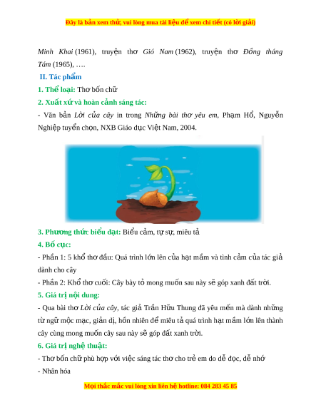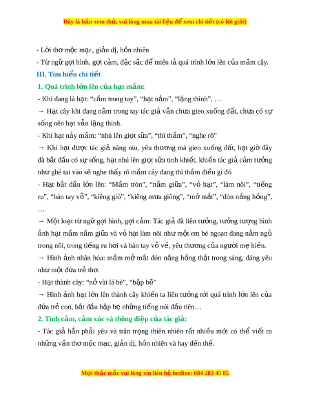 Đây là bản xem th , vu ử i lòng mua tài li u ệ đ xe ể m chi ti t (c ế ó l i ờ gi i ả ) - L i ờ thơ m c m ộ c, ạ gi n d ả , h ị n nhi ồ ên - T ng ừ g ữ i ợ hình, g i ợ c m ả , đ c ặ s c ắ đ m ể iêu t quá ả trình l n l ớ ên c a ủ m m ầ cây. III. Tìm hi u chi ể ti t ế 1. Quá trình l n ớ lên c a h ủ t ạ m m ầ : - Khi đang là h t ạ : “c m ầ trong tay”, “h t ạ n m ằ ”, “l ng ặ thinh”, … → H t ạ cây khi đang n m ằ trong tay tác gi ả v n ẫ ch a ư gieo xu ng ố đ t ấ , ch a ư có sự sống nên h t ạ vẫn l ng t ặ hinh. - Khi h t ạ n y ả m m ầ : “nhú lên gi t ọ s a”, ữ “thì th m ầ ”, “nghe rõ” → Khi h t ạ đư c