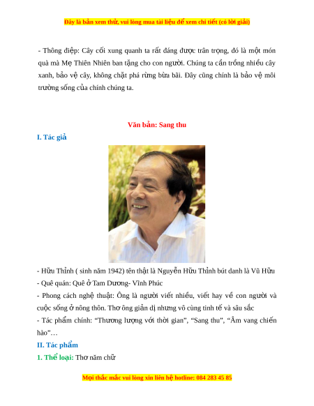 ừ bãi. Đây cũng chính là b o ả vệ môi trư ng s ờ ống c a ủ chính chúng ta. Văn bản: Sang thu I. Tác giả - H u ữ Th nh ( ỉ sinh năm 1942) tên th t ậ là Nguy n H ễ u ữ Th nh bút ỉ danh là Vũ H u ữ